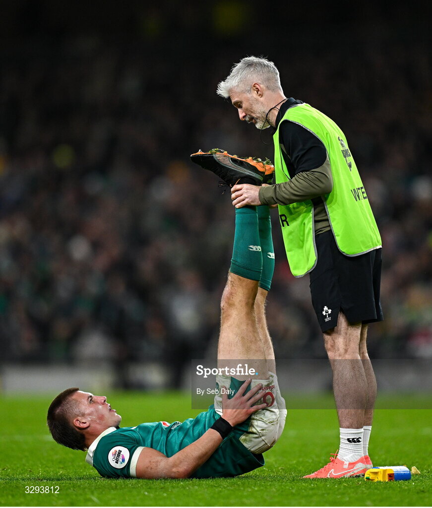 15 November 2025; Sam Prendergast of Ireland and Ireland head of athletic performance Aled Walters during the Quilter Nations Series 2025 match between Ireland and Australia at the Aviva Stadium in Dublin. Photo by Seb Daly/Sportsfile