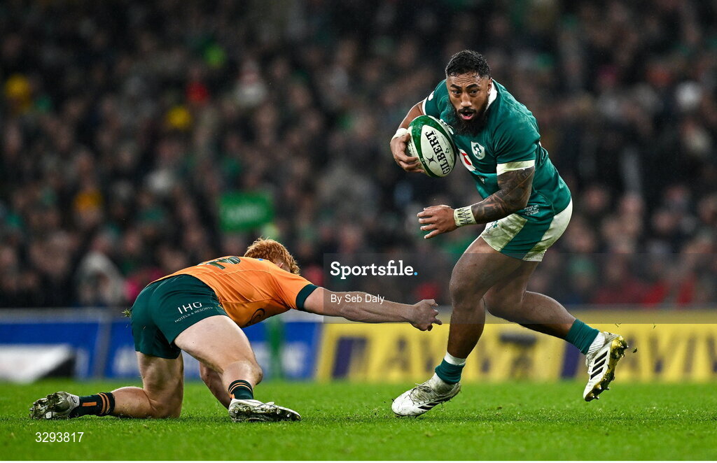15 November 2025; Bundee Aki of Ireland evades the tackle of Australia's Tane Edmed during the Quilter Nations Series 2025 match between Ireland and Australia at the Aviva Stadium in Dublin. Photo by Seb Daly/Sportsfile
