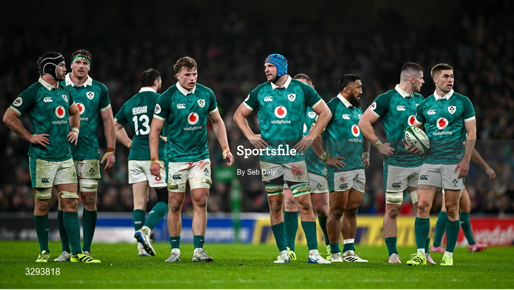 15 November 2025; Ireland players, from left, Caelan Doris, Ryan Baird, Cian Prendergast, Tadhg Beirne, Bundee Aki, Nick Timoney and Jack Crowley during the Quilter Nations Series 2025 match between Ireland and Australia at the Aviva Stadium in Dublin. Photo by Seb Daly/Sportsfile