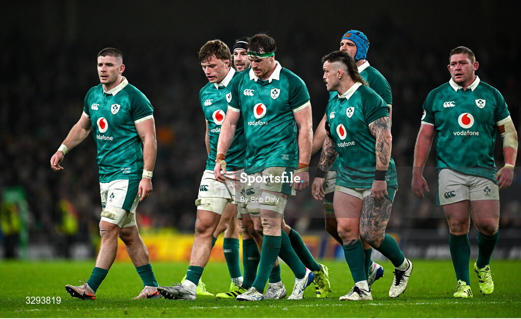 15 November 2025; Ireland players, from left, Nick Timoney, Cian Prendergast, Caelan Doris, Ryan Baird, Andrew Porter, Tadhg Beirne anf Tadhg Furlong during the Quilter Nations Series 2025 match between Ireland and Australia at the Aviva Stadium in Dublin. Photo by Seb Daly/Sportsfile