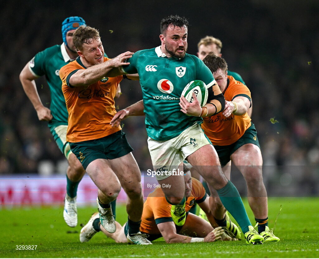 15 November 2025; Rónan Kelleher of Ireland is tackled by Harry Potter of Australia, left, during the Quilter Nations Series 2025 match between Ireland and Australia at the Aviva Stadium in Dublin. Photo by Seb Daly/Sportsfile