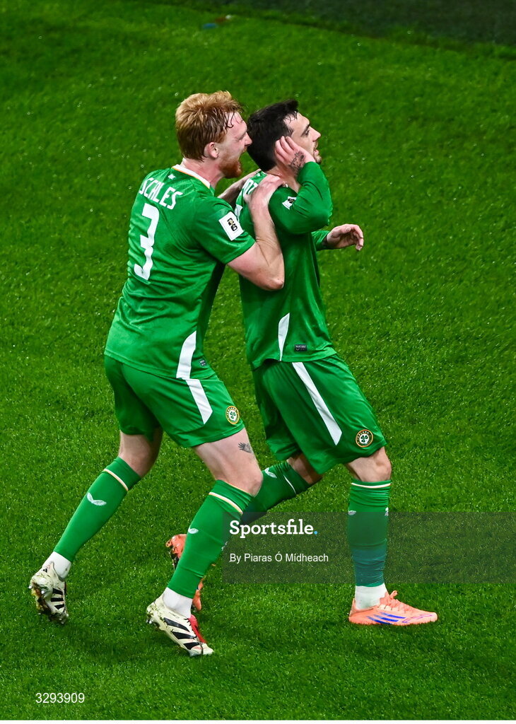 13 November 2025; Troy Parrott of Republic of Ireland, right, celebrates with team-mate Liam Scales after scoring their side's first goal during the FIFA World Cup 2026 Group F Qualifier match between Republic of Ireland and Portugal at the Aviva Stadium in Dublin. Photo by Piaras Ó Mídheach/Sportsfile