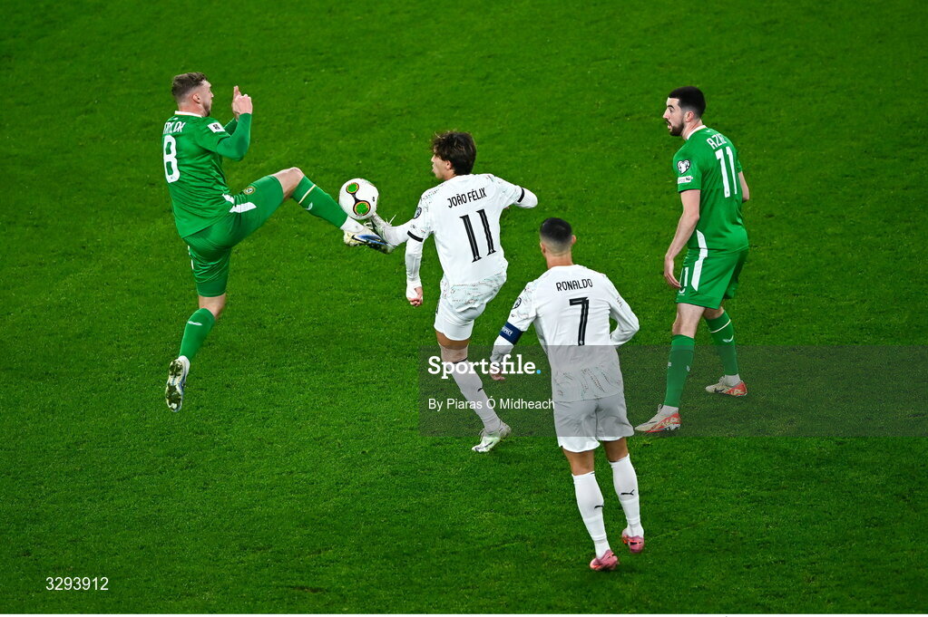13 November 2025; Jack Taylor of Republic of Ireland in action against Joao Félix of Portugal during the FIFA World Cup 2026 Group F Qualifier match between Republic of Ireland and Portugal at the Aviva Stadium in Dublin. Photo by Piaras Ó Mídheach/Sportsfile
