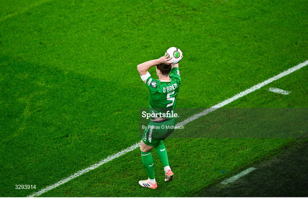 13 November 2025; Jake O'Brien of Republic of Ireland prepares to take a throw-in during the FIFA World Cup 2026 Group F Qualifier match between Republic of Ireland and Portugal at the Aviva Stadium in Dublin. Photo by Piaras Ó Mídheach/Sportsfile
