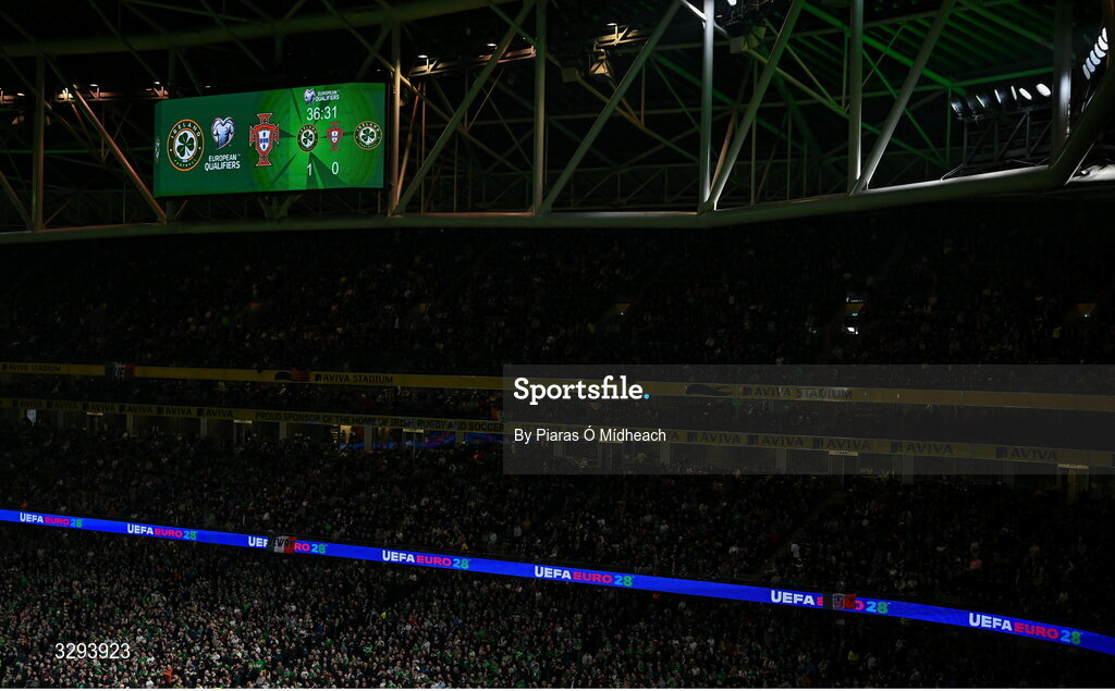 13 November 2025; Branding for UEFA Euro 2028 during the FIFA World Cup 2026 Group F Qualifier match between Republic of Ireland and Portugal at the Aviva Stadium in Dublin. Photo by Piaras Ó Mídheach/Sportsfile