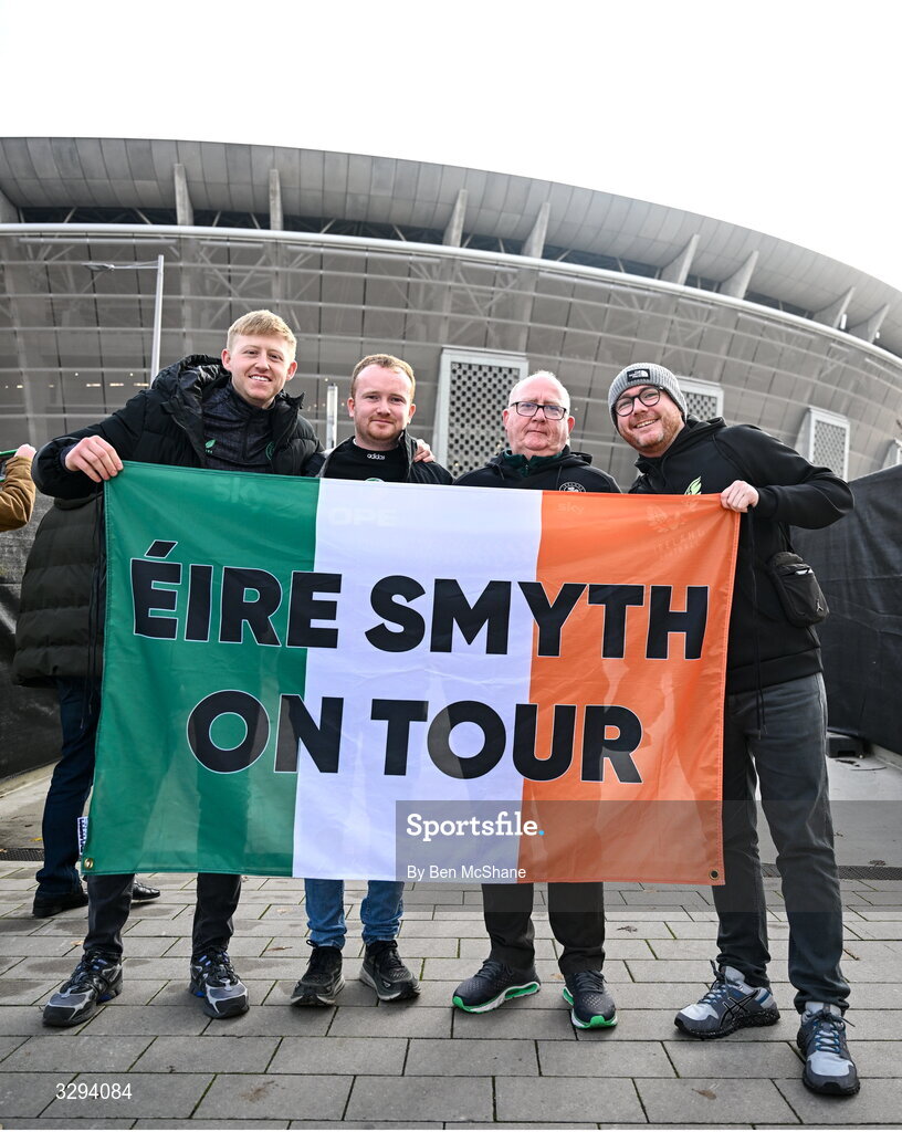 16 November 2025; Republic of Ireland supporters Conor Geraghty, David Smyth, Mark Smyth and Shane Smyth before the FIFA World Cup 2026 Group F Qualifier match between Hungary and Republic of Ireland at Puskás Aréna in Budapest, Hungary. Photo by Ben McShane/Sportsfile