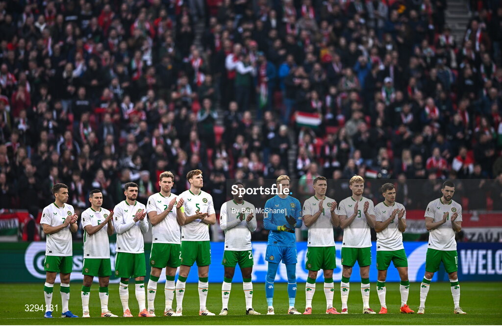 16 November 2025; The Republic of Ireland team, from left, Seamus Coleman, Josh Cullen, Troy Parrott, Nathan Collins, Jake O'Brien, Chiedozie Ogbene, Caoimhin Kelleher, Dara O'Shea, Liam Scales, Jayson Molumby and Finn Azaz before the FIFA World Cup 2026 Group F Qualifier match between Hungary and Republic of Ireland at Puskás Aréna in Budapest, Hungary. Photo by Ben McShane/Sportsfile