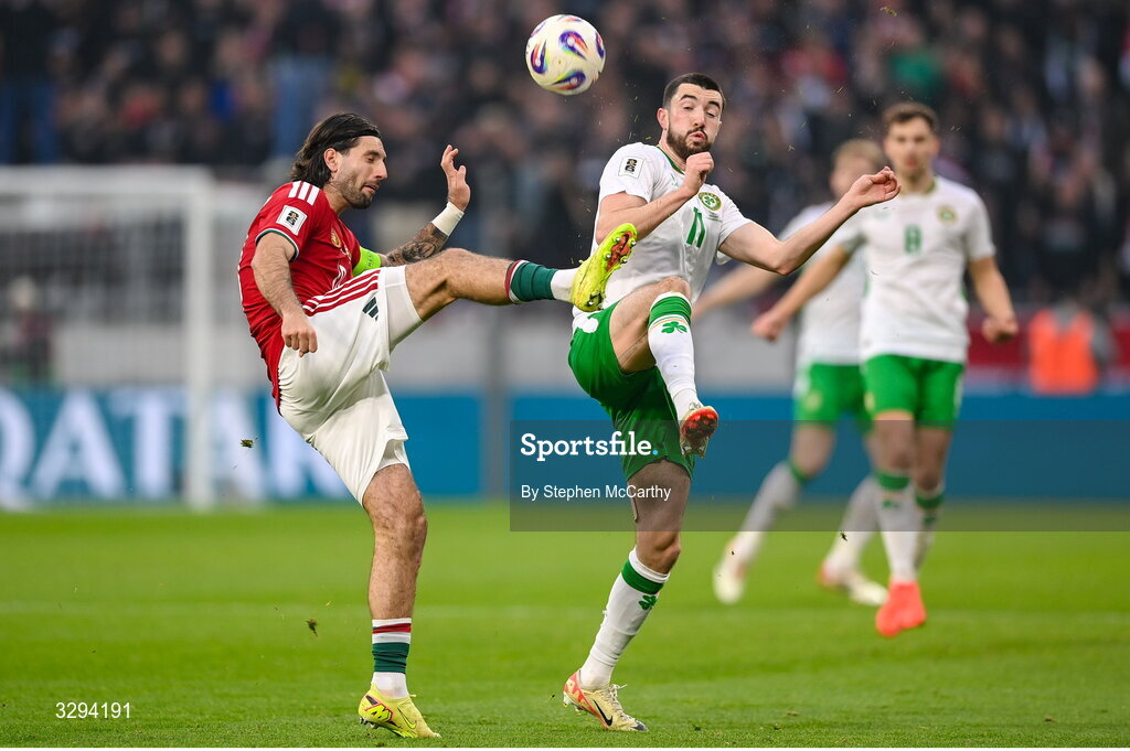 16 November 2025; Dominik Szoboszlai of Hungary in action against Finn Azaz of Republic of Ireland during the FIFA World Cup 2026 Group F Qualifier match between Hungary and Republic of Ireland at Puskás Aréna in Budapest, Hungary. Photo by Stephen McCarthy/Sportsfile