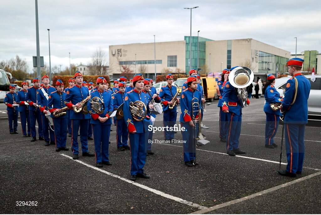 16 November 2025; The Artane band waits outside the grounds before the AIB Leinster Camogie Senior Club Championship final match between Dicksboro and Oulart-The Ballagh at SETU in Carlow. Photo by Thomas Flinkow/Sportsfile