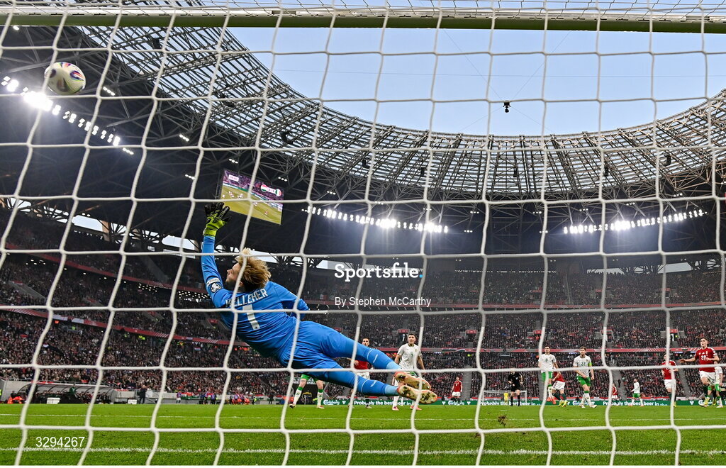 16 November 2025; Republic of Ireland goalkeeper Caoimhin Kelleher concedes a second goal, from Barnabás Varga of Hungary, during the FIFA World Cup 2026 Group F Qualifier match between Hungary and Republic of Ireland at Puskás Aréna in Budapest, Hungary. Photo by Stephen McCarthy/Sportsfile