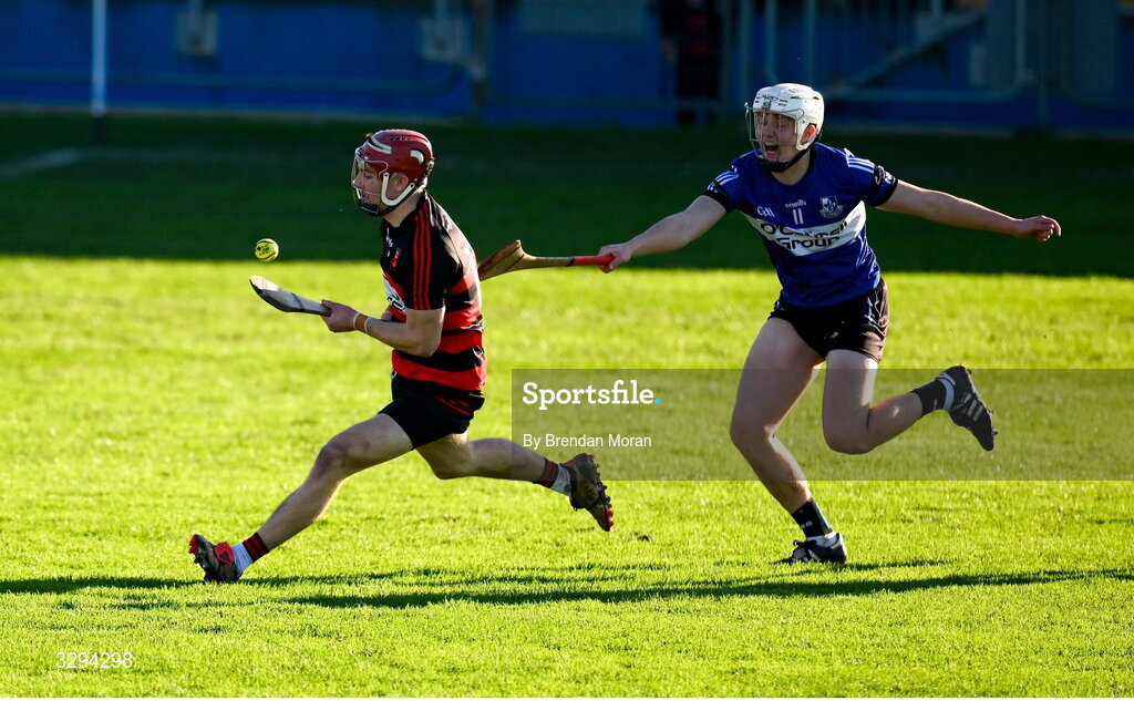 16 November 2025; Patrick Fitzgerald of Ballygunner gets away from Colm McCarthy of Sarsfields on the way to scoring his side's third goal during the AIB Munster GAA Hurling Senior Club Championship semi-final match between Ballygunner and Sarsfields at Azzurri Walsh Park in Waterford. Photo by Brendan Moran/Sportsfile