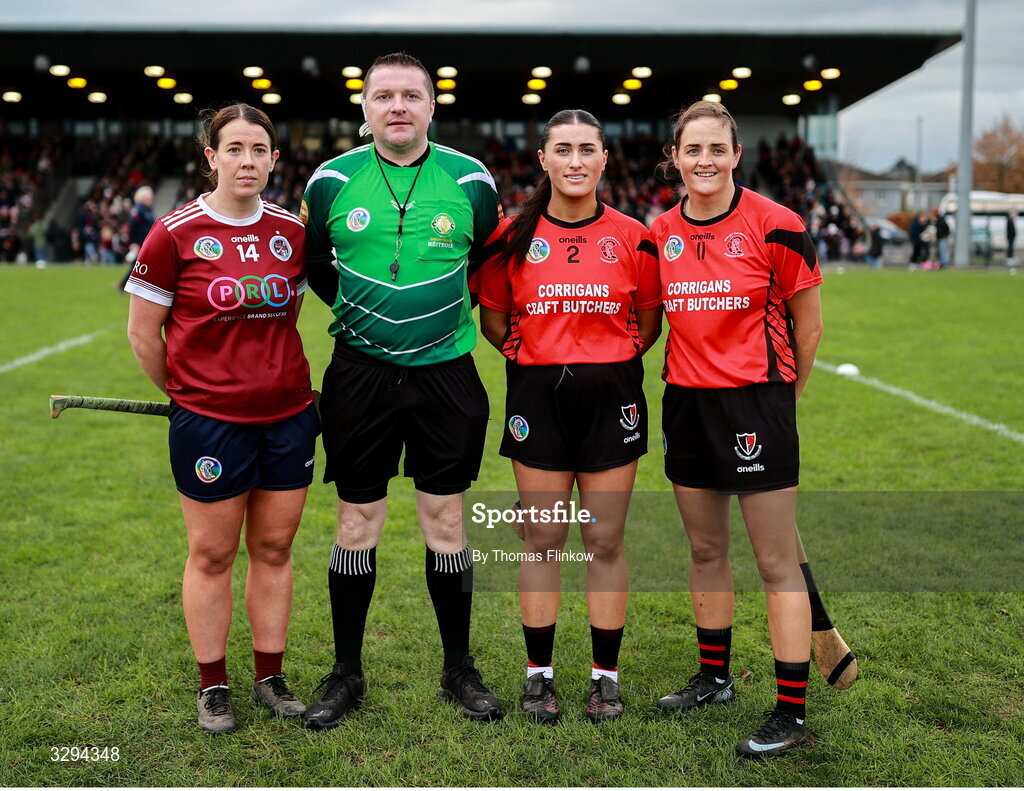 16 November 2025; Referee Brian Kearney with Dicksboro captain Orla Hanrick and Oulart-The Ballagh joint captains Miria O'Dowd and Shelly Kehoe, right, before the AIB Leinster Camogie Senior Club Championship final match between Dicksboro and Oulart-The Ballagh at SETU in Carlow. Photo by Thomas Flinkow/Sportsfile