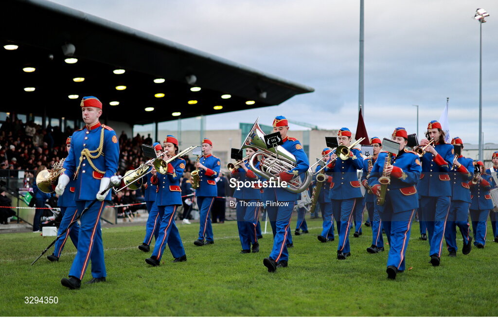 16 November 2025; The Artane band before the AIB Leinster Camogie Senior Club Championship final match between Dicksboro and Oulart-The Ballagh at SETU in Carlow. Photo by Thomas Flinkow/Sportsfile