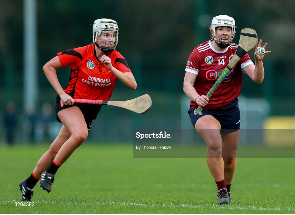 16 November 2025; Orla Hanrick of Dicksboro in action against Siobhan Sinnott of Oulart-The Ballagh during the AIB Leinster Camogie Senior Club Championship final match between Dicksboro and Oulart-The Ballagh at SETU in Carlow. Photo by Thomas Flinkow/Sportsfile