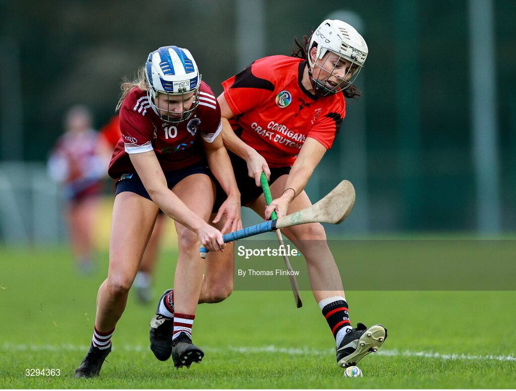 16 November 2025; Mary Leacy of Oulart-The Ballagh in action against Asha McHardy of Dicksboro during the AIB Leinster Camogie Senior Club Championship final match between Dicksboro and Oulart-The Ballagh at SETU in Carlow. Photo by Thomas Flinkow/Sportsfile