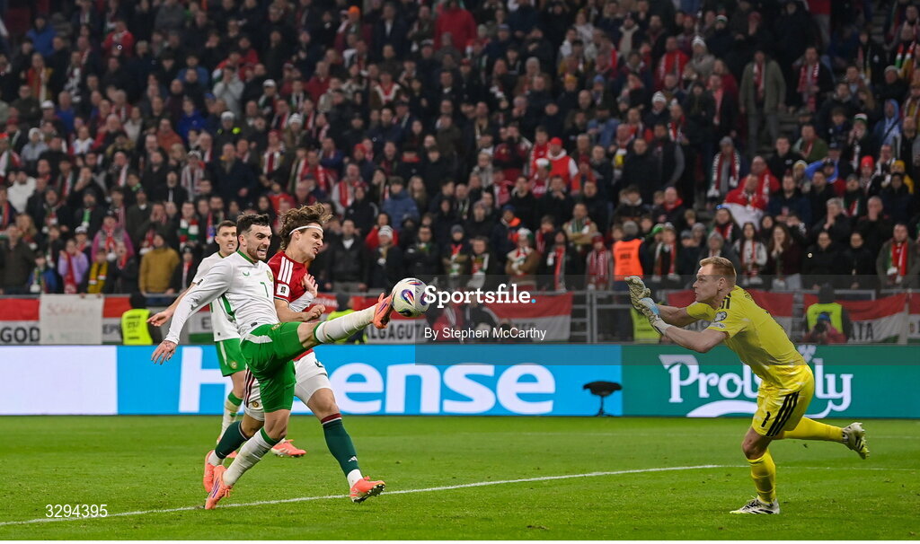 16 November 2025; Troy Parrott of Republic of Ireland scores his side's third goal past Hungary goalkeeper Dénes Dibusz during the FIFA World Cup 2026 Group F Qualifier match between Hungary and Republic of Ireland at Puskás Aréna in Budapest, Hungary. Photo by Stephen McCarthy/Sportsfile