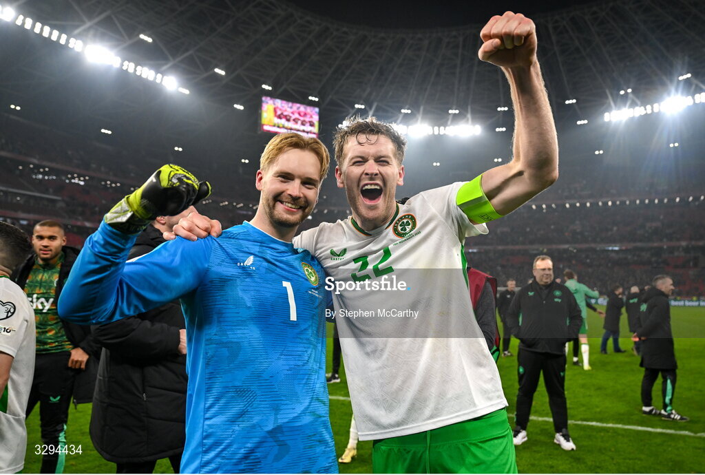 16 November 2025; Republic of Ireland goalkeeper Caoimhin Kelleher, left, and Nathan Collins celebrate after the FIFA World Cup 2026 Group F Qualifier match between Hungary and Republic of Ireland at Puskás Aréna in Budapest, Hungary. Photo by Stephen McCarthy/Sportsfile