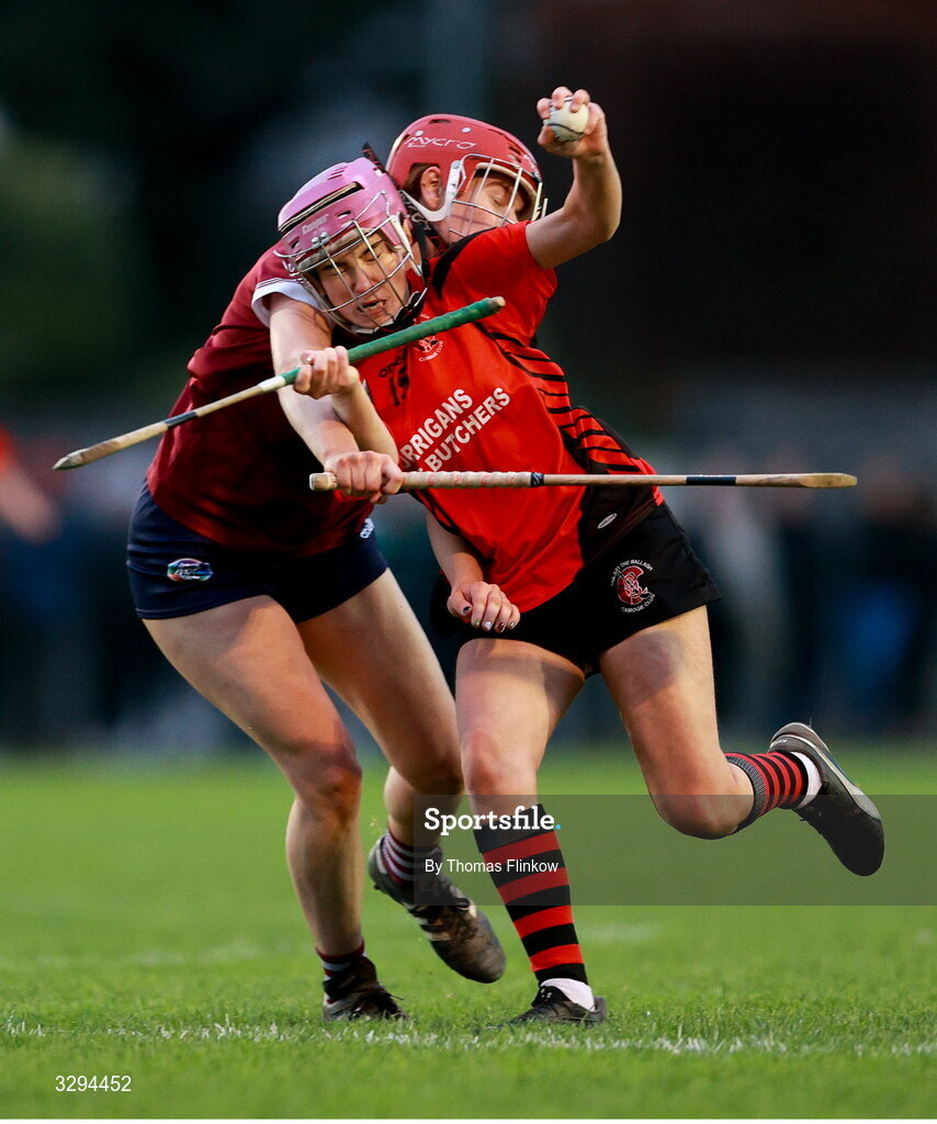 16 November 2025; Molly Martin of Oulart-The Ballagh in action against Angela Carroll of Dicksboro during the AIB Leinster Camogie Senior Club Championship final match between Dicksboro and Oulart-The Ballagh at SETU in Carlow. Photo by Thomas Flinkow/Sportsfile