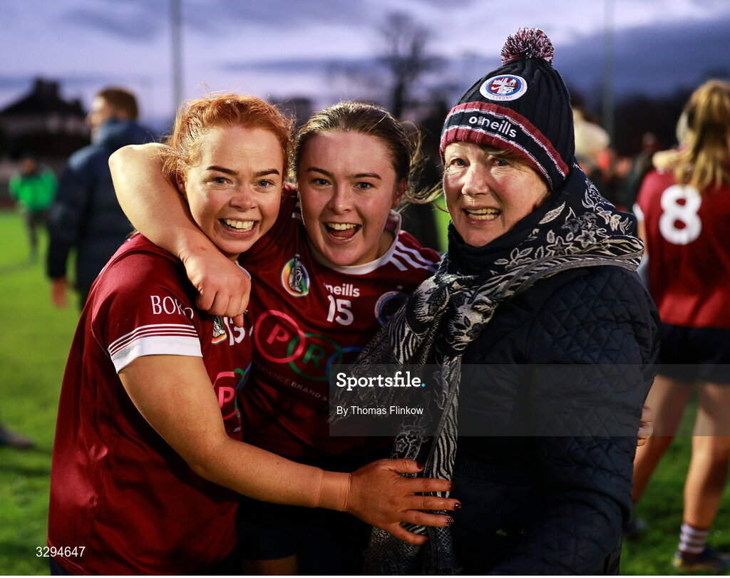 16 November 2025; Jenny Clifford, left, and Amy Clifford of Dicksboro celebrate with family after the AIB Leinster Camogie Senior Club Championship final match between Dicksboro and Oulart-The Ballagh at SETU in Carlow. Photo by Thomas Flinkow/Sportsfile
