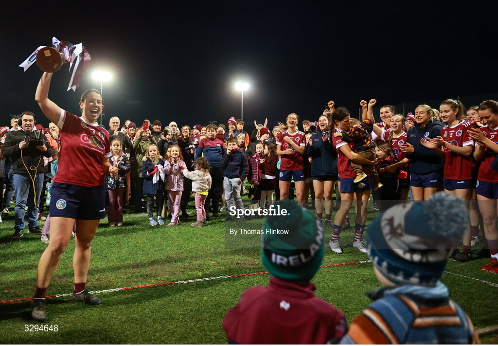 16 November 2025; Orla Hanrick of Dicksboro lifts the cup after the AIB Leinster Camogie Senior Club Championship final match between Dicksboro and Oulart-The Ballagh at SETU in Carlow. Photo by Thomas Flinkow/Sportsfile