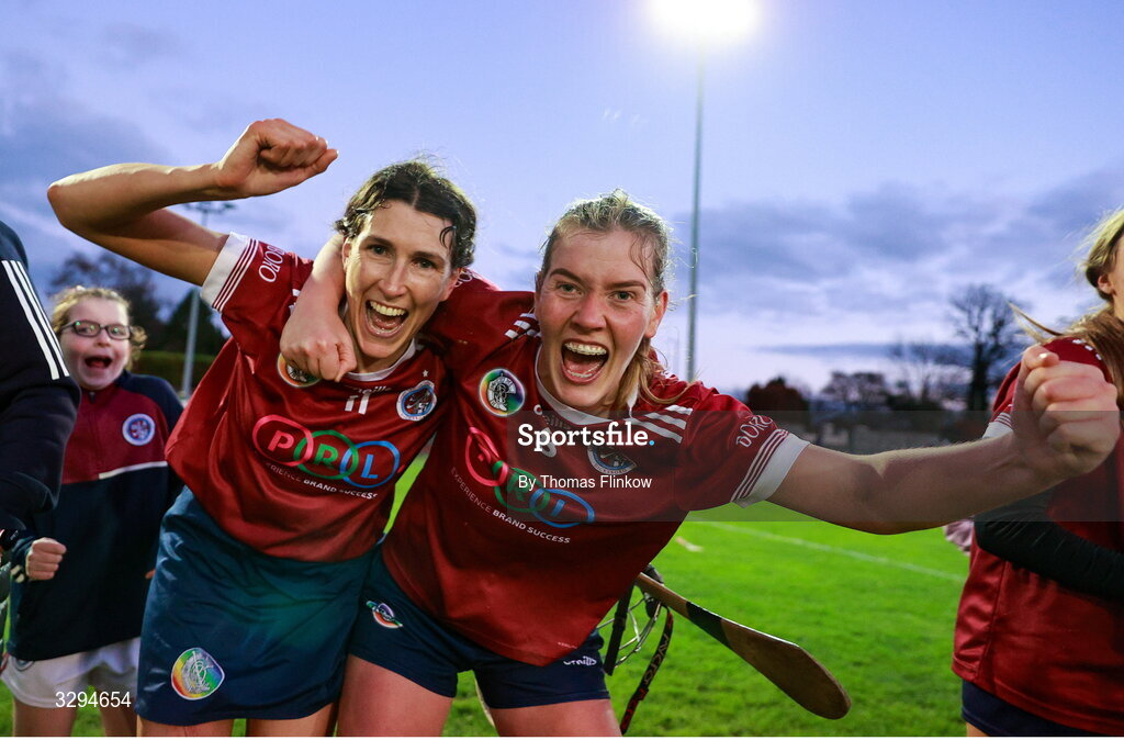 16 November 2025; Lucinda Gahan, left, celebrates with Aoife Prendergast of Dicksboro after their side's victory in the AIB Leinster Camogie Senior Club Championship final match between Dicksboro and Oulart-The Ballagh at SETU in Carlow. Photo by Thomas Flinkow/Sportsfile