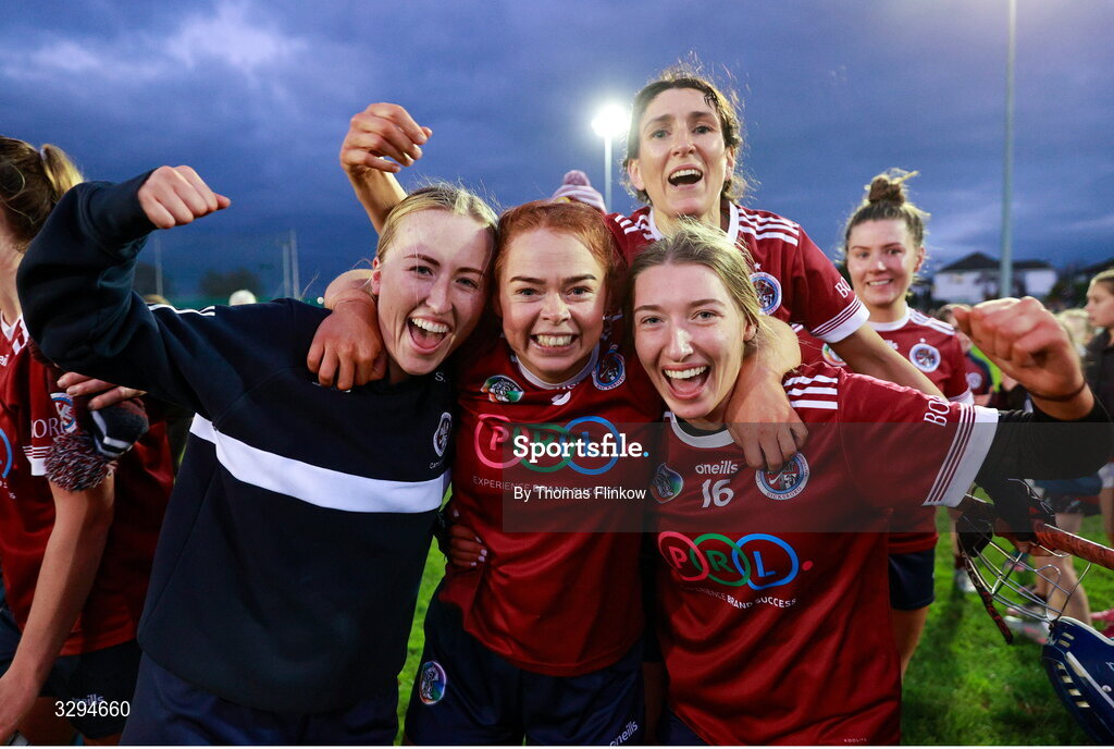 16 November 2025; Dicksboro players celebrate after their side's victory in the AIB Leinster Camogie Senior Club Championship final match between Dicksboro and Oulart-The Ballagh at SETU in Carlow. Photo by Thomas Flinkow/Sportsfile
