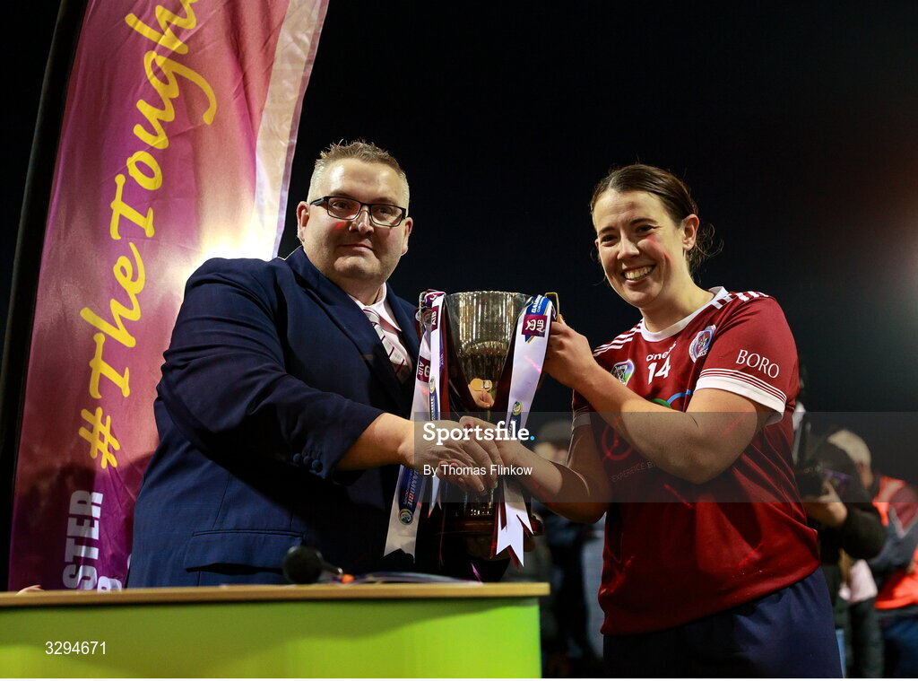 16 November 2025; Chairperson of the Leinster camogie association Martin Quilty presents the cup to Dicksboro captain Orla Hanrick after the AIB Leinster Camogie Senior Club Championship final match between Dicksboro and Oulart-The Ballagh at SETU in Carlow. Photo by Thomas Flinkow/Sportsfile
