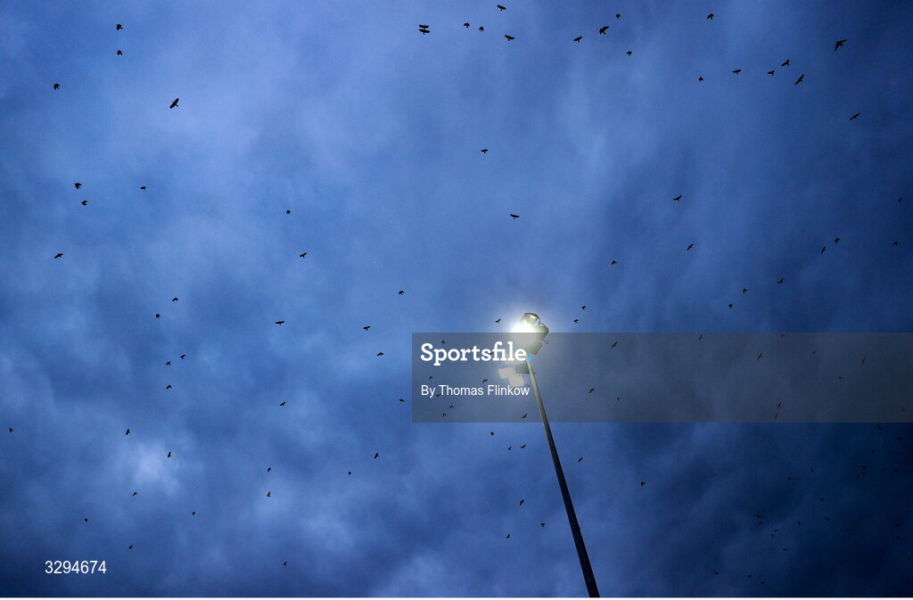 16 November 2025; Birds are seen flying over the pitch during the AIB Leinster Camogie Senior Club Championship final match between Dicksboro and Oulart-The Ballagh at SETU in Carlow. Photo by Thomas Flinkow/Sportsfile