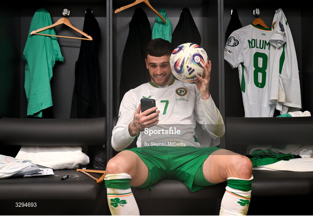 16 November 2025; Troy Parrott of Republic of Ireland celebrates with the match ball in the dressing room after scoring a hat-trick in the FIFA World Cup 2026 Group F Qualifier match between Hungary and Republic of Ireland at Puskás Aréna in Budapest, Hungary. Photo by Stephen McCarthy/Sportsfile