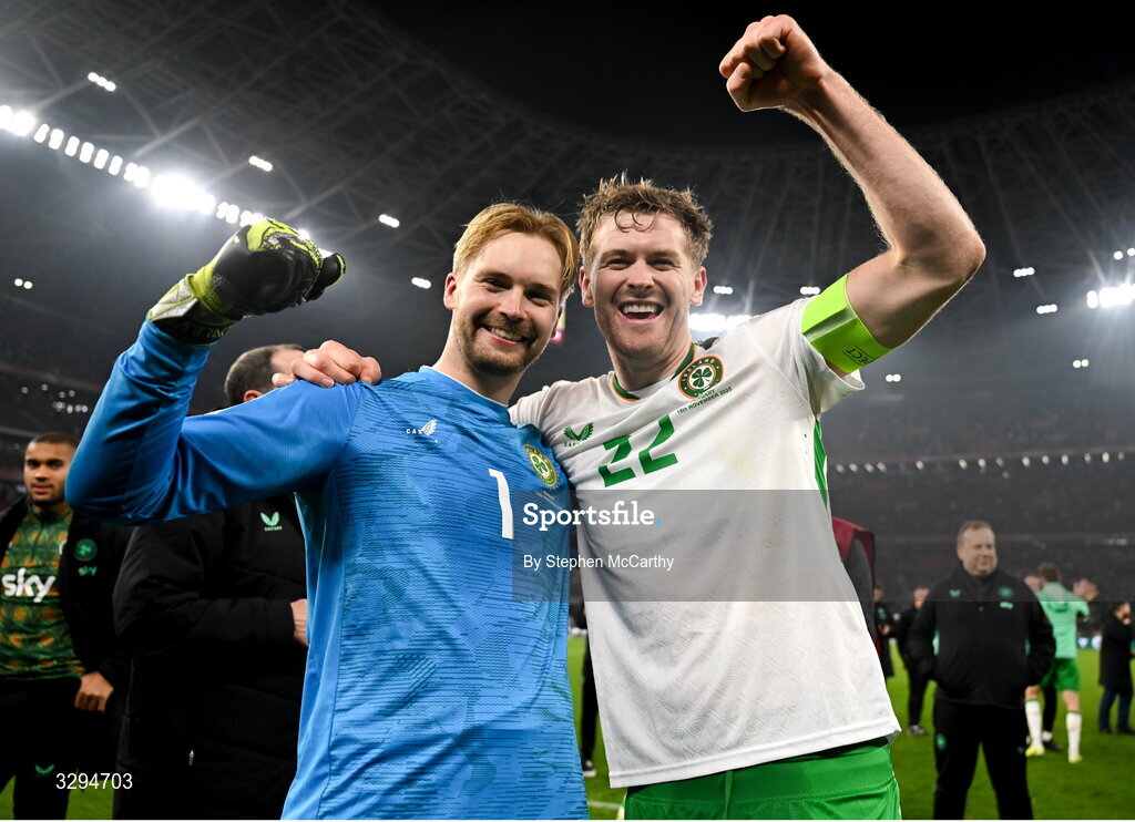 16 November 2025; Republic of Ireland goalkeeper Caoimhin Kelleher and Nathan Collins celebrate after the FIFA World Cup 2026 Group F Qualifier match between Hungary and Republic of Ireland at Puskás Aréna in Budapest, Hungary. Photo by Stephen McCarthy/Sportsfile