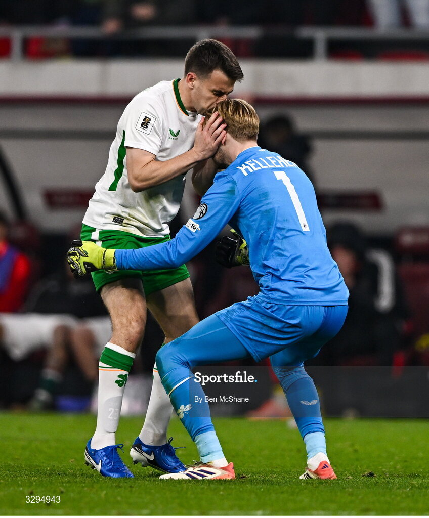 16 November 2025; Seamus Coleman of Republic of Ireland and Republic of Ireland goalkeeper Caoimhin Kelleher celebrate at the final whistle of the FIFA World Cup 2026 Group F Qualifier match between Hungary and Republic of Ireland at Puskás Aréna in Budapest, Hungary. Photo by Ben McShane/Sportsfile