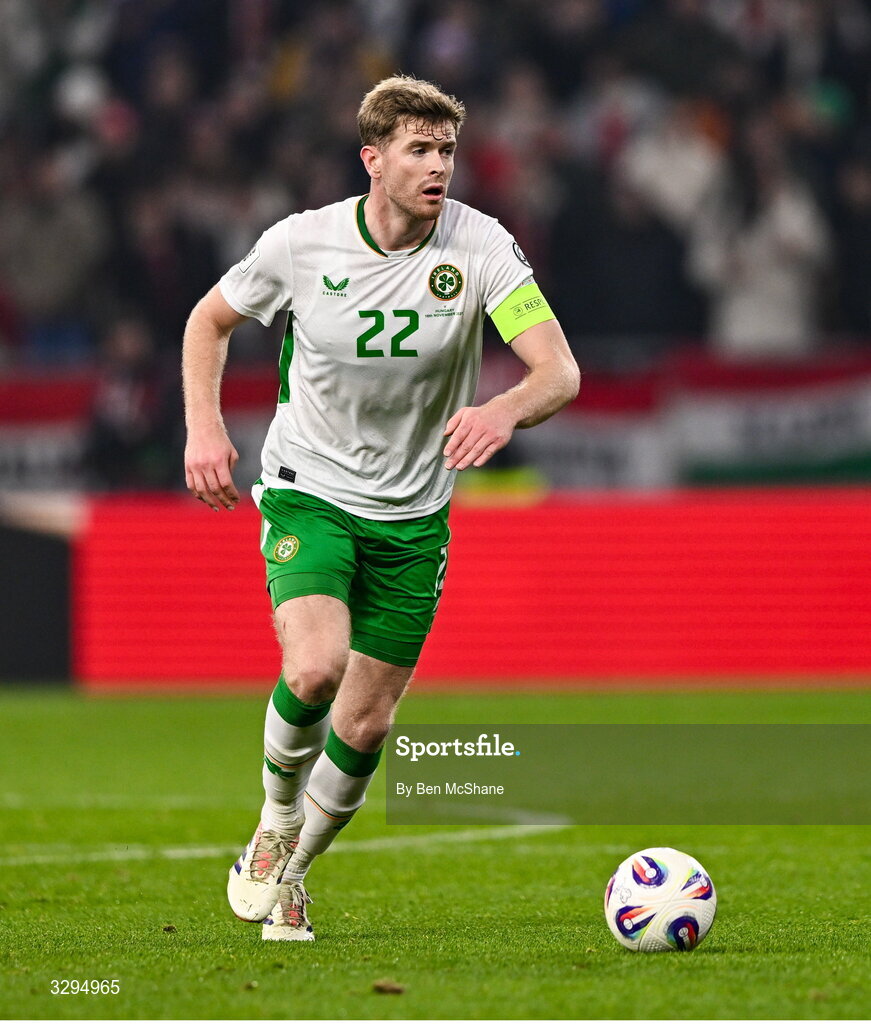 16 November 2025; Nathan Collins of Republic of Ireland during the FIFA World Cup 2026 Group F Qualifier match between Hungary and Republic of Ireland at Puskás Aréna in Budapest, Hungary. Photo by Ben McShane/Sportsfile