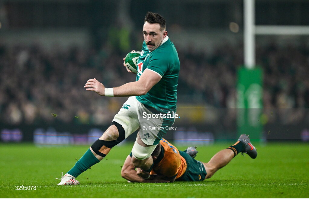 15 November 2025; Jack Conan of Ireland is tackled by Jake Gordon of Australia during the Quilter Nations Series 2025 match between Ireland and Australia at the Aviva Stadium in Dublin. Photo by Ramsey Cardy/Sportsfile