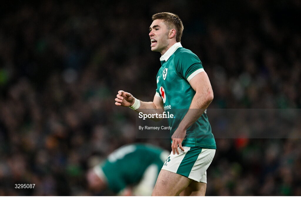 15 November 2025; Jack Crowley of Ireland during the Quilter Nations Series 2025 match between Ireland and Australia at the Aviva Stadium in Dublin. Photo by Ramsey Cardy/Sportsfile