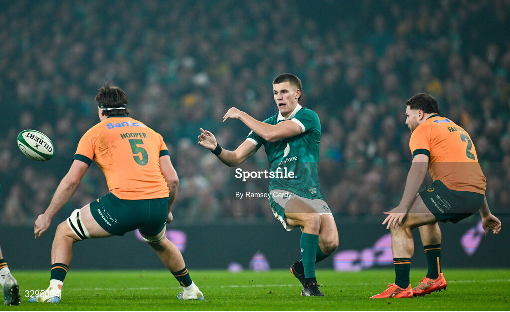 15 November 2025; Sam Prendergast of Ireland during the Quilter Nations Series 2025 match between Ireland and Australia at the Aviva Stadium in Dublin. Photo by Ramsey Cardy/Sportsfile