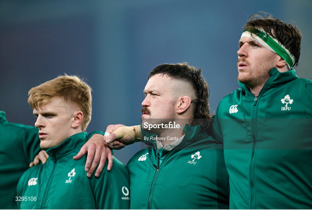 15 November 2025; Ireland players, from left, Tommy O’Brien, Andrew Porter and Ryan Baird before the Quilter Nations Series 2025 match between Ireland and Australia at the Aviva Stadium in Dublin. Photo by Ramsey Cardy/Sportsfile