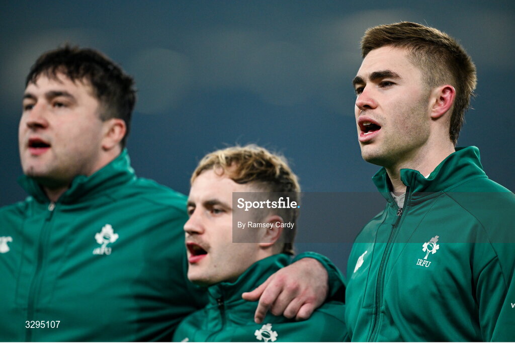 15 November 2025; Ireland players, from right, Jack Crowley, Craig Casey and Thomas Clarkson before the Quilter Nations Series 2025 match between Ireland and Australia at the Aviva Stadium in Dublin. Photo by Ramsey Cardy/Sportsfile