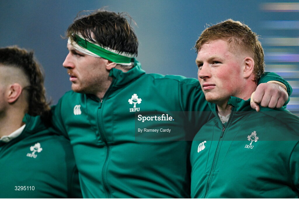 15 November 2025; Paddy McCarthy, right, and Ryan Baird of Ireland before the Quilter Nations Series 2025 match between Ireland and Australia at the Aviva Stadium in Dublin. Photo by Ramsey Cardy/Sportsfile