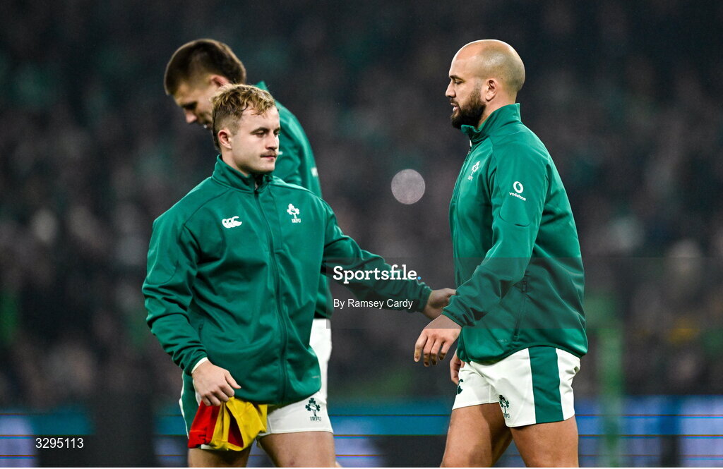 15 November 2025; Craig Casey, left, and Jamison Gibson-Park of Ireland before the Quilter Nations Series 2025 match between Ireland and Australia at the Aviva Stadium in Dublin. Photo by Ramsey Cardy/Sportsfile