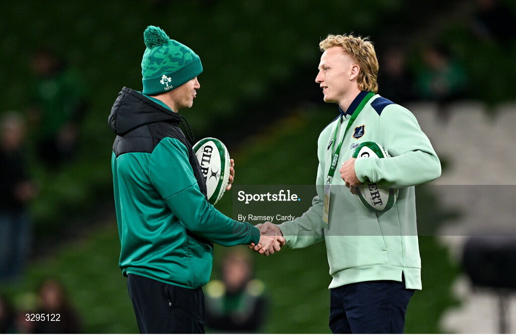 15 November 2025; Ireland assistant coach Jonathan Sexton, left, and Carter Gordon of Australia before the Quilter Nations Series 2025 match between Ireland and Australia at the Aviva Stadium in Dublin. Photo by Ramsey Cardy/Sportsfile