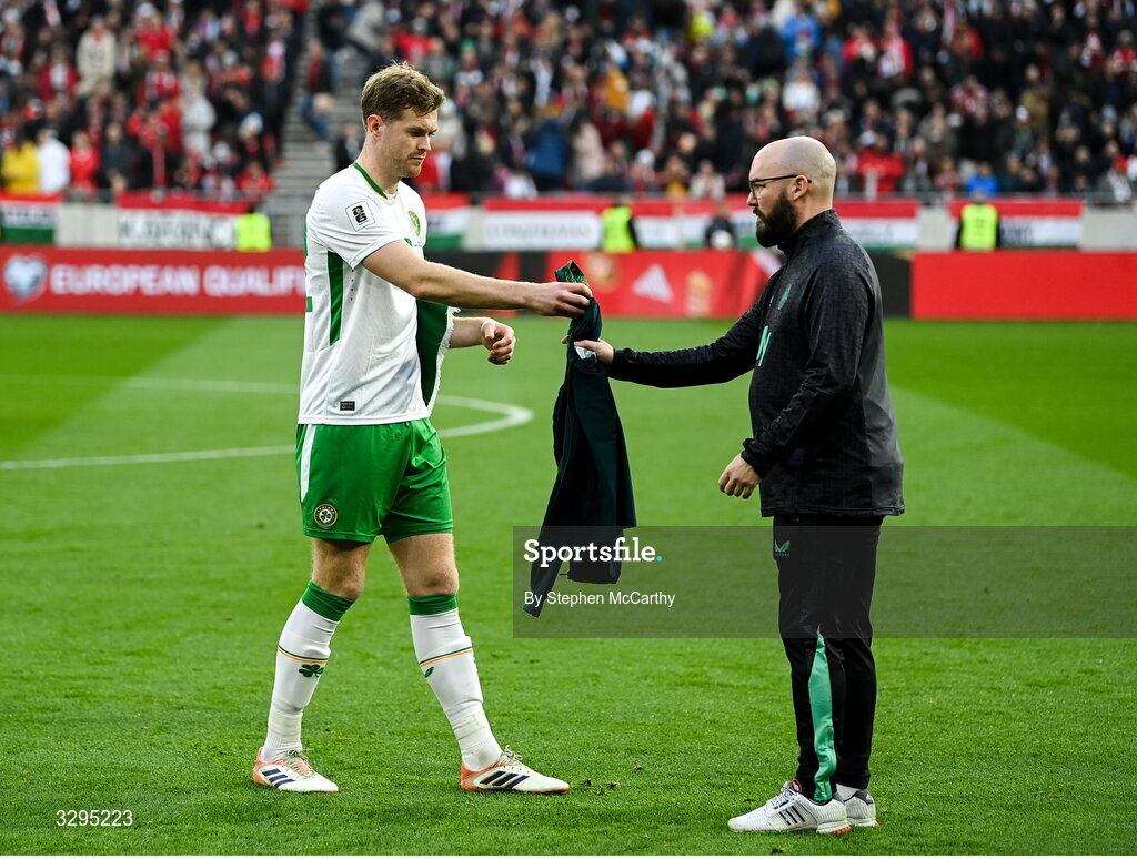 16 November 2025; Republic of Ireland captain Nathan Collins and kit and equipment manager Karl McKenna before the FIFA World Cup 2026 Group F Qualifier match between Hungary and Republic of Ireland at Puskás Aréna in Budapest, Hungary. Photo by Stephen McCarthy/Sportsfile