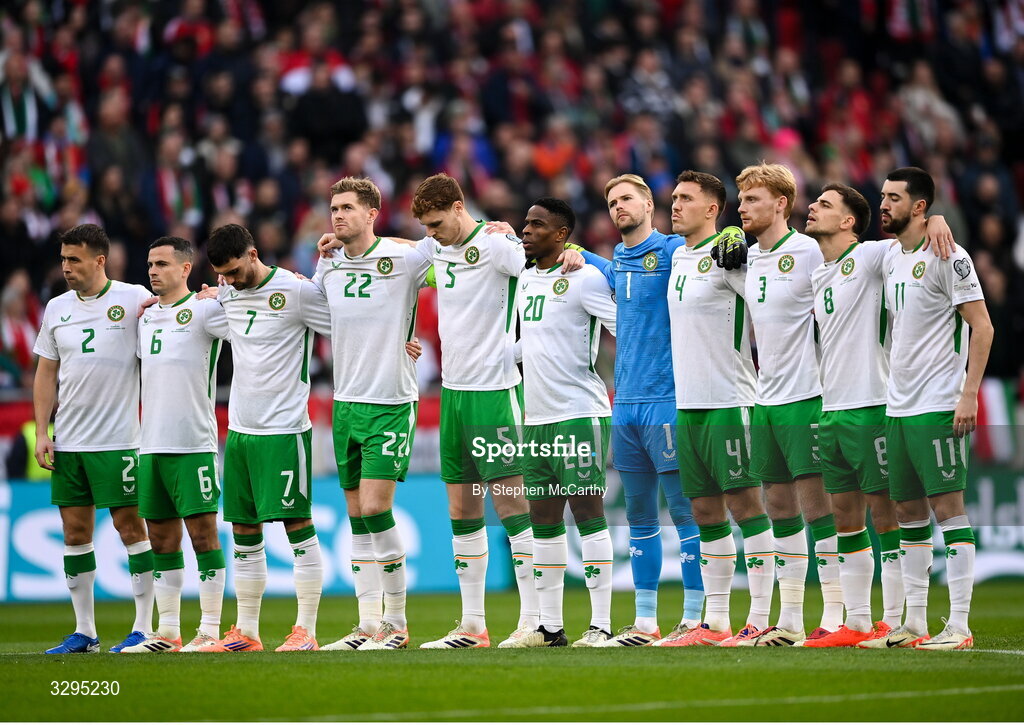 16 November 2025; Republic of Ireland players stand for a moments silence before the FIFA World Cup 2026 Group F Qualifier match between Hungary and Republic of Ireland at Puskás Aréna in Budapest, Hungary. Photo by Stephen McCarthy/Sportsfile