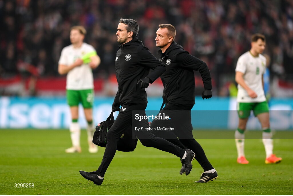 16 November 2025; Republic of Ireland team doctor Sean Carmody, left, and lead physiotherapist Danny Miller, right, during the FIFA World Cup 2026 Group F Qualifier match between Hungary and Republic of Ireland at Puskás Aréna in Budapest, Hungary. Photo by Stephen McCarthy/Sportsfile