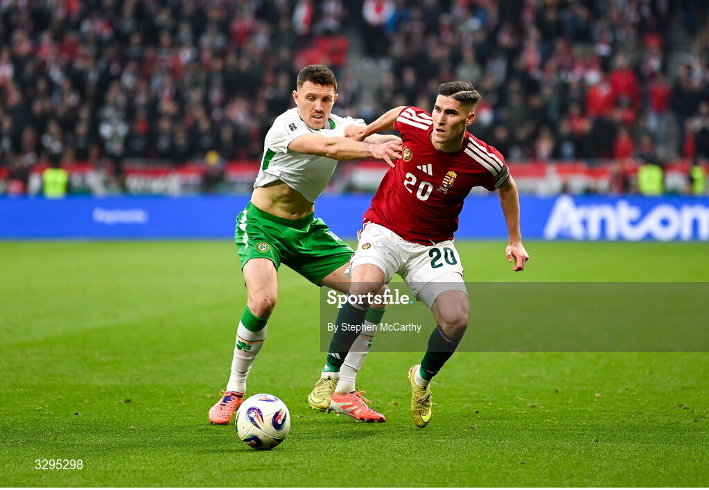 16 November 2025; Roland Sallai of Hungary in action against Dara O'Shea of Republic of Ireland during the FIFA World Cup 2026 Group F Qualifier match between Hungary and Republic of Ireland at Puskás Aréna in Budapest, Hungary. Photo by Stephen McCarthy/Sportsfile