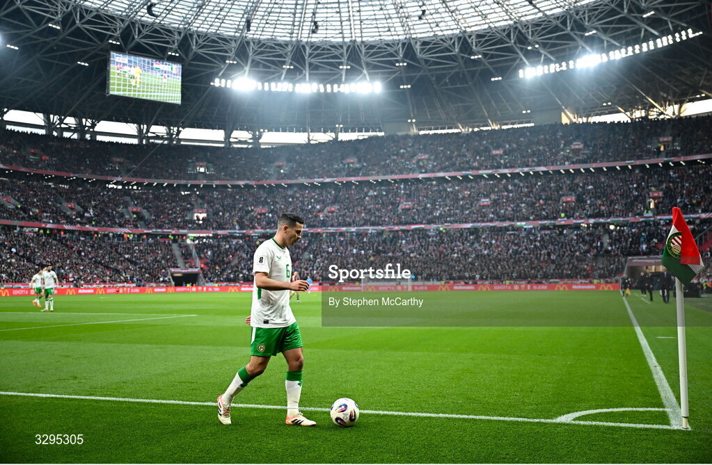 16 November 2025; Josh Cullen of Republic of Ireland during the FIFA World Cup 2026 Group F Qualifier match between Hungary and Republic of Ireland at Puskás Aréna in Budapest, Hungary. Photo by Stephen McCarthy/Sportsfile