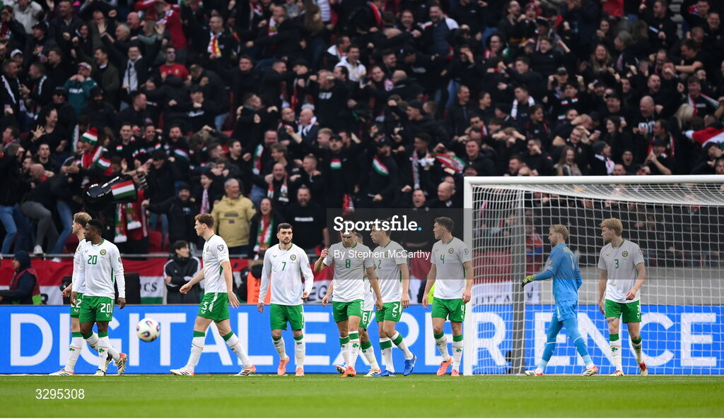 16 November 2025; Republic of Ireland players after Hungary socred their opening goal during the FIFA World Cup 2026 Group F Qualifier match between Hungary and Republic of Ireland at Puskás Aréna in Budapest, Hungary. Photo by Stephen McCarthy/Sportsfile