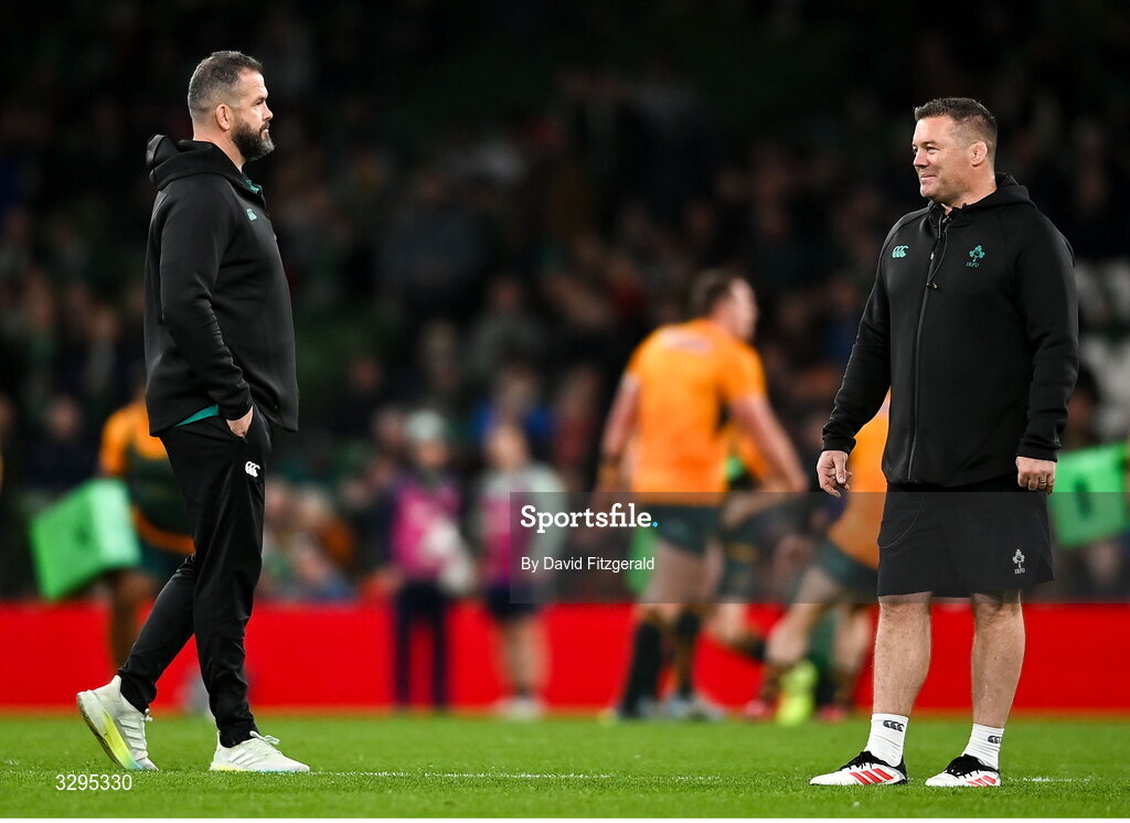 15 November 2025; Ireland head coach Andy Farrell, left, and assistant coach John Fogarty before the Quilter Nations Series 2025 match between Ireland and Australia at the Aviva Stadium in Dublin. Photo by David Fitzgerald/Sportsfile
