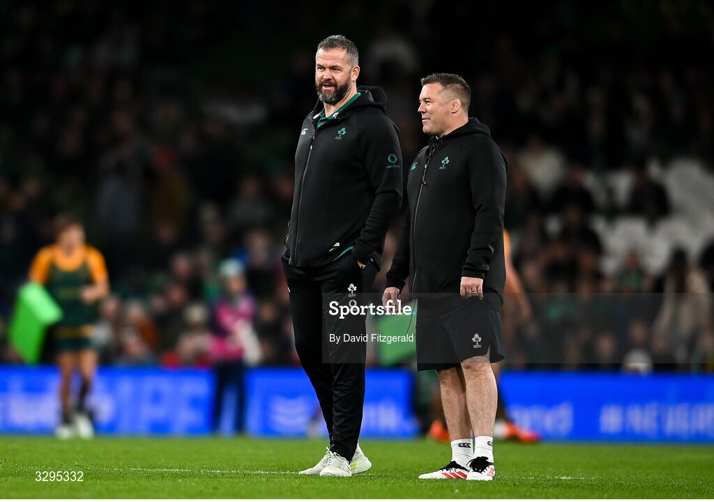 15 November 2025; Ireland head coach Andy Farrell, left, and assistant coach John Fogarty before the Quilter Nations Series 2025 match between Ireland and Australia at the Aviva Stadium in Dublin. Photo by David Fitzgerald/Sportsfile
