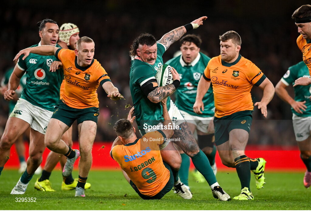 15 November 2025; Andrew Porter of Ireland is tackled by Jake Gordon of Australia during the Quilter Nations Series 2025 match between Ireland and Australia at the Aviva Stadium in Dublin. Photo by David Fitzgerald/Sportsfile
