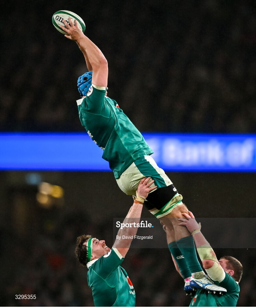 15 November 2025; Tadhg Beirne of Ireland gathers possession from a lineout during the Quilter Nations Series 2025 match between Ireland and Australia at the Aviva Stadium in Dublin. Photo by David Fitzgerald/Sportsfile
